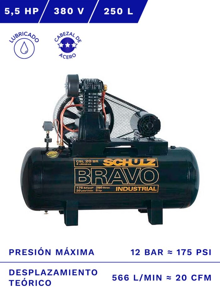 En resumen, el compresor de aire modelo CSL-20BR/250 de la línea Bravo es un equipo versátil, resistente y de alta calidad, capaz de ofrecer un alto desempeño operacional y una larga vida útil en cualquier proyecto.
